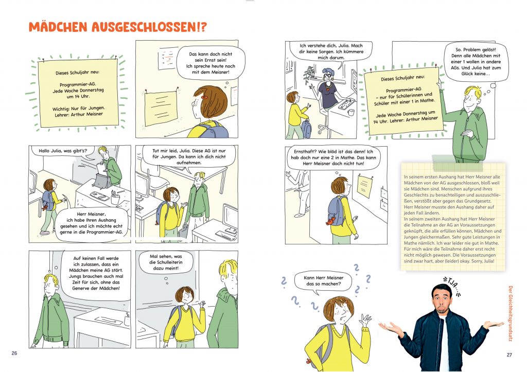 Sherif Rizkallah hat für sein Buch „Kennst Du Deine Rechte?“ DK 2025, ISBN 978-3-8310-5209-7 kleine Comicgeschichten zum Nachdenken über unsere Rechte geschrieben. 16 Grundrechte werden immer an Beispielen aus dem Schulalltag vorgestellt. Sie enden mit einer Frage die zum Nachdenken über die Grenzen der Rechte anregt. Zum Glück gibt Sherif auch noch eine Antwort mit verständlicher Erklärung 🙂